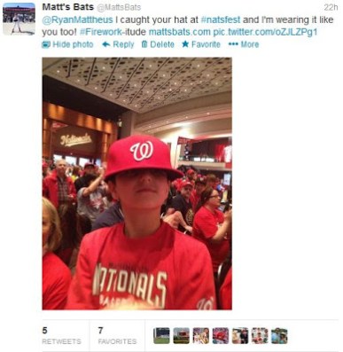 As they were walking off stage, Ryan Mattheus threw his hat into the crowd.  I bet you won’t believe who caught it.  ME (actually my dad, but I am going to share it with my brother)!  I am sometimes the luckiest person.  I tweeted him a picture of me wearing it the same way he wears his hat, and he retweeted it.  (Ryan, if you read this, you should follow me!)