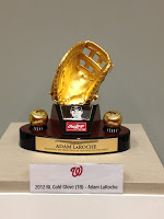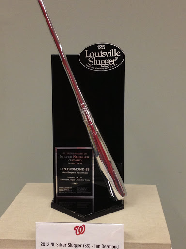 We saw Bryce Harper’s Rookie of the Year trophy, Ian Desmond’s Silver Slugger, Adam LaRoche’s Gold Glove and Silver Slugger, and Stephen Strasburg’s Silver Slugger.  Here are a few pictures we took.