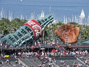 But AT&T Park is the home of the famous Coke bottle and baseball glove on the promenade, which are actually play areas for kids. Kids can actually slide down the inside of the Coke bottle. There is also a miniature version of AT&T Park that kids can play whiffle ball in. Also, there is a Ghiradelli Cable Car that you can sit in and take pictures. It is actually a cable car that was used to roam the streets of San Fran, but it was retired and brought to the stadium.