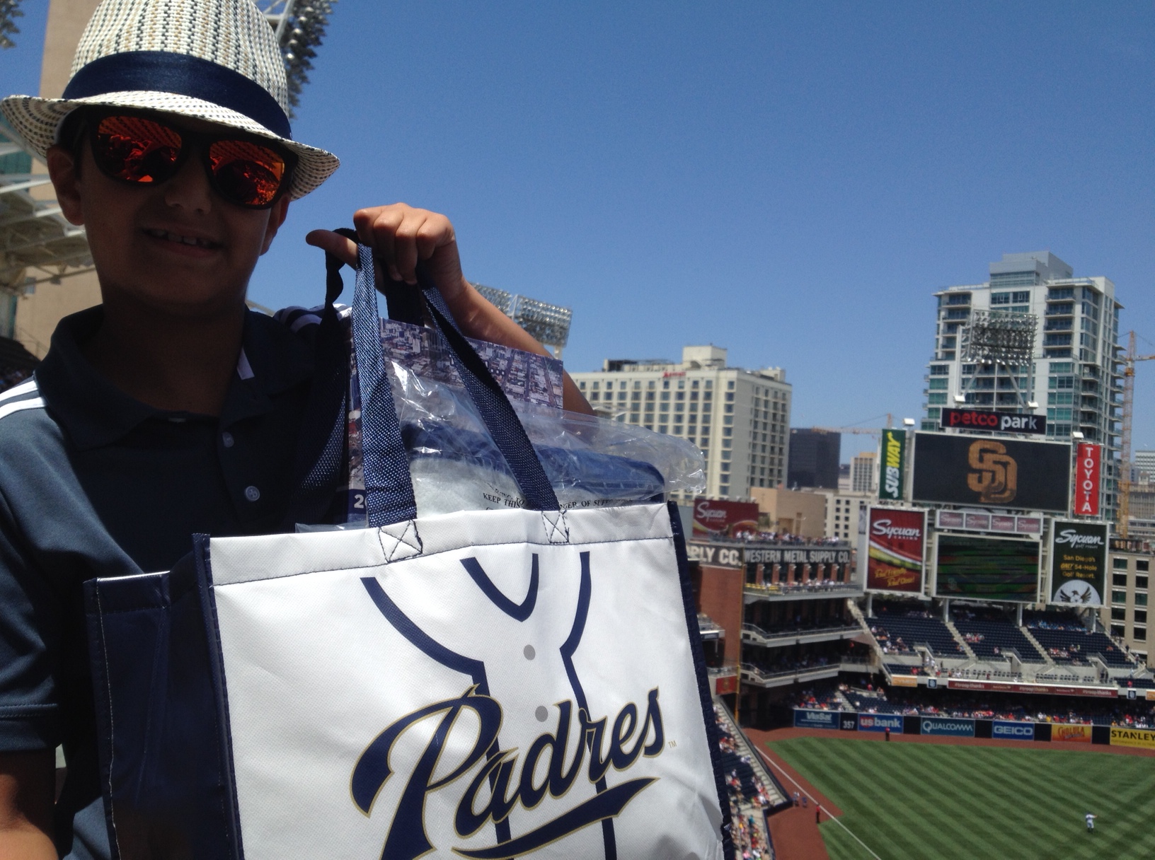 Patrick then brought out a surprise for me and my brother: a swag bag made up of lots of the promo items that the Padres gave away this year. The bag included t-shirts, sunglasses, a beach towel, a travel blanket, a gumball machine, a Petco Park 10 year anniversary photo, and my favorite-a fedora.