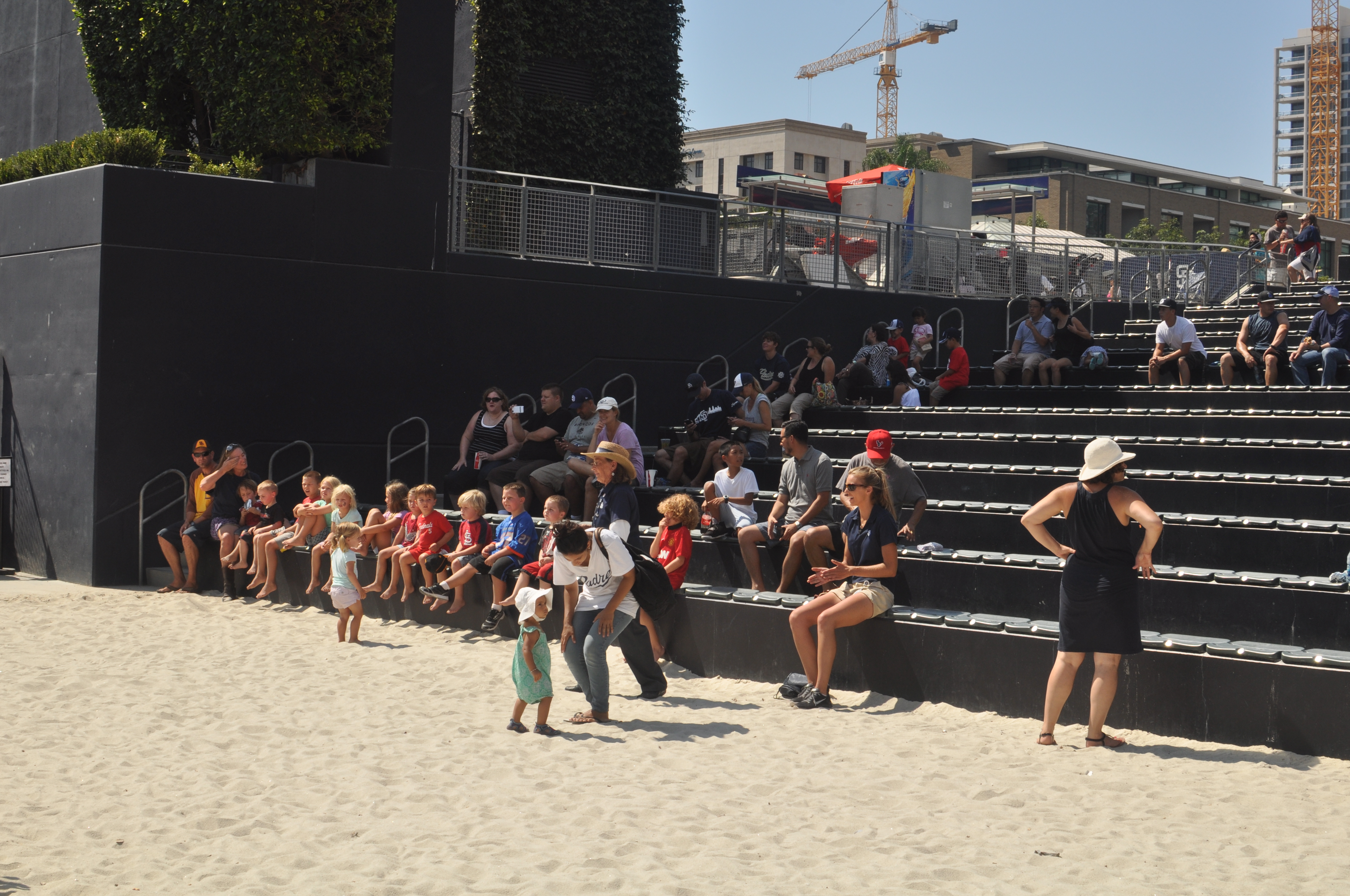 Petco Park also has a little beach area with sand and beach toys for kids and bleachers which is right up against the centerfield wall. If you go, I’d recommend sitting where we did (section 300), the Bleachers, or a picnic blanket at Park at The Park. I’d also recommend sitting in Section 134, which is literally right next to the stacked home and visitors bullpens. You have a great view of the bullpens from an open stairway, but you can be even closer to the action all game from Section 134. Most of the seats are in the sun, except for some of the 200 seats. I think by the afternoon, the 3rd base side starts to get shady. This is important because it is so sunny in San Diego.