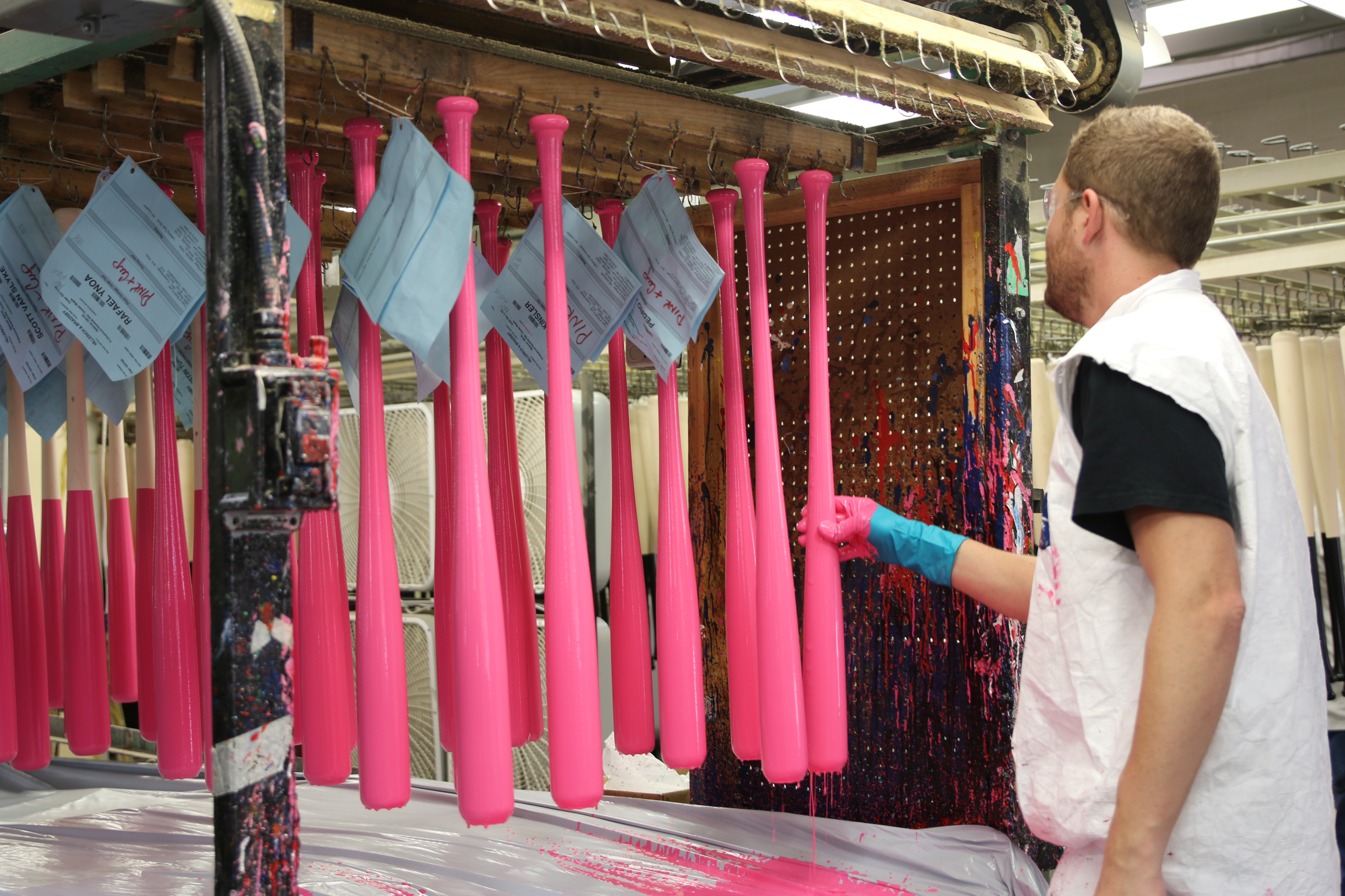 The bats are made the same way as a regular baseball bat. They are made just the right length and weight for each individual player. However, when they get to the painting station, they hold and turn the bat in pink paint until the bat is either half covered or fully covered in pink paint (according to the player’s choice). After it’s stamped with the player’s name and autograph, it’s ready for shipping.