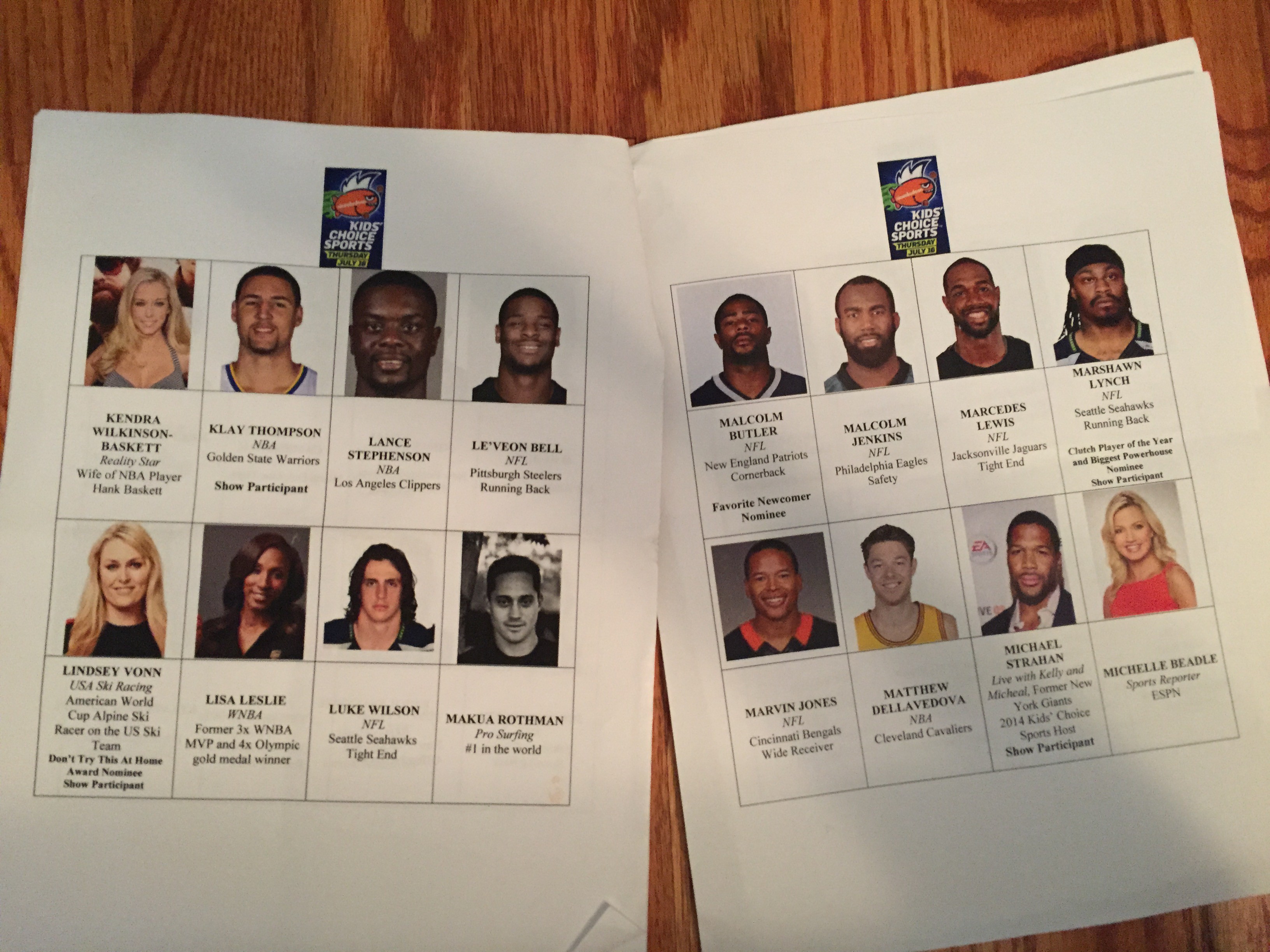 When we checked in, all media were given a big packet containing pictures and names of the athletes and other “talent” that were expected to attend. I was amazed at the HUGE list! I’m a really big sports fan, but I don’t know too many football and basketball players, so I was really glad to have pictures and descriptions of all the people expected to walk down the carpet. Even still, I was kind of worried that I wouldn’t have enough time to learn everyone’s name, face, and team to recognize them as they walked by.