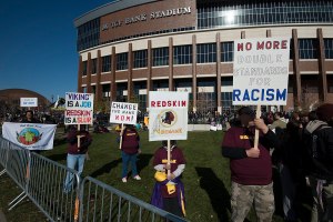 Activists protest the Washington NFL team name before a game outside TCF Bank Stadium in Minneapolis. Photo credit Fibonacci Blue/Creative Commons