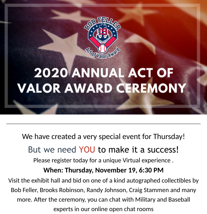 You can register for the 2020 Bob Feller Act of Valor Award ceremony for free by following this link. Alongside the ceremony, there will be a virtual auction where you can bid on autographed items from this year’s winners and prior recipients. The Act of Valor Award ceremony is a great way to support our troops and remember the service of a great American, Bob Feller.