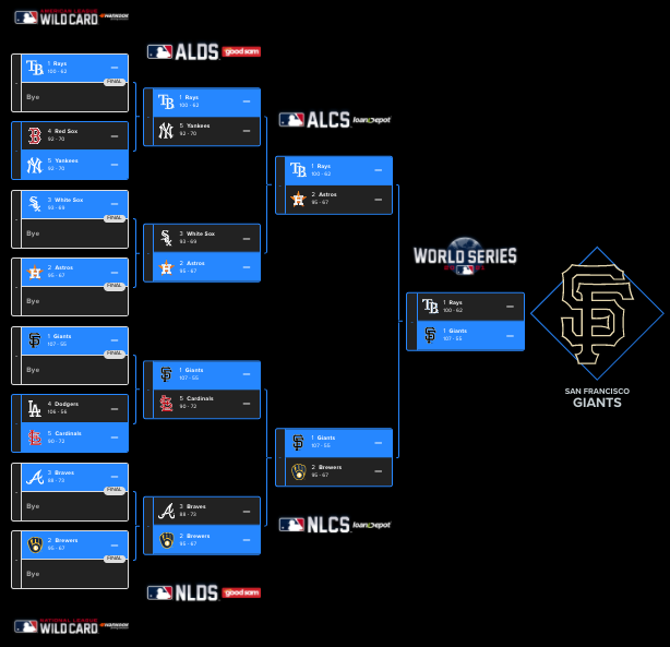 Another year where we avoid a Yankees-Dodgers World Series is a successful year. While the bosses at MLB are not going to like this series for low TV ratings, baseball fans should be really excited about the possibility of a Rays-Giants series. Both Gabe Kapler and Kevin Cash belong to the same, analytics-driven school of managerial philosophy, and both teams built very similar rosters. Pitching is the strong suit for both clubs, but they have a flair for the dramatic and lineups that are built for offensive success. This series could go either way. My gut tells me that in a head to head matchup, the Giants come out on top in seven games. The Rays have an incredibly strong pitching staff, but they do not have the equivalent of a Kevin Gausman or a Logan Webb in their rotation. This will end up being the deciding factor, along with the postseason experience Posey, Crawford, and Belt bring to the table.